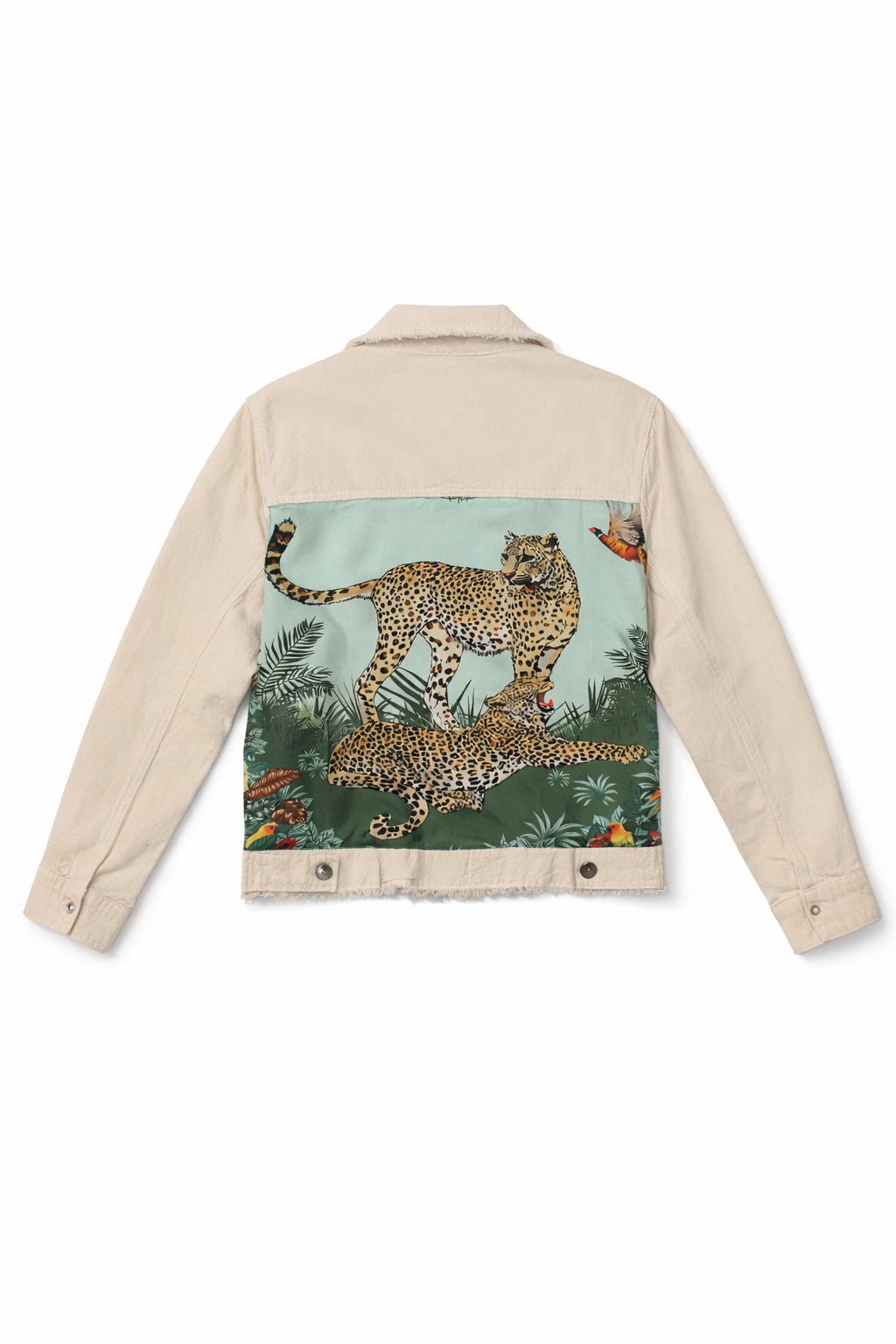 A beige lightweight cotton jacket is accented on the back with a jaguar jungle scene satin scarf. This unique piece attracts compliments with its chic yet simple look. Pair with a tee, denim, and boots.